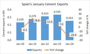 In January 2024, Spain produced 1.169 Mt of cement, after 1.437 Mt in January 2023. This is a YoY decline by -18.7%, after the -3.1% annual decline in 2023. Please note: If you will find other data, e.g. in news sections, these here are official, accurate and reliable data from the Spanish Government.