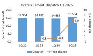 In the first quarter in 2025, Spain’s cement production increased by +1.4%% to 4.189 Mt, after 4.133 Mt in the same period last year and 4.620 Mt in the year before.