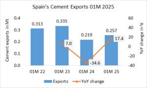 In January 2025, Spain’s cement production increased by +4.5% to 1.265 Mt, after 1.211 Mt in the same period last year and 1.437 Mt in the year before.
