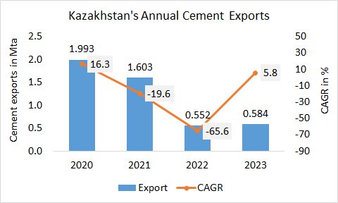 In 2023, Kazakhstan exported 0.584 Mta of cement. This an increase by +5.8%, when compared with 2022. The exports in 2023 were going to 3 countries, Uzbekistan 47.1%, Kyrgyzstan 29.6% and Russia 23.2%.