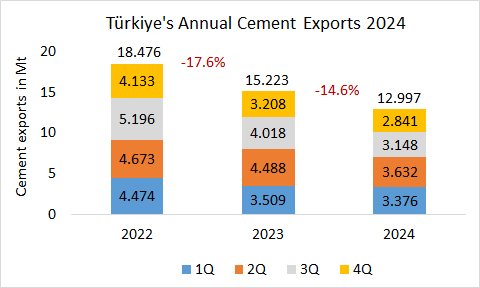 Türkiye’s annual cement exports decreased by -14.6% to 12.997 Mt, after 15.223 Mt in the same period last year and 18.476 Mt in the year before.