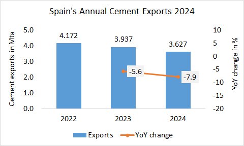The annual cement exports from Spain declined by -7.9% to 3.627 Mta, after 3.937 Mta in the last year and 4.172 Mta in 2022.