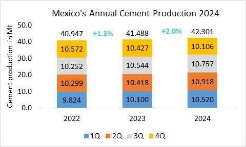 The annual cement production (of integrated plants) in Mexico increased by +2.0% to 42.301 Mta, after 41.488 Mta in the last year and 40.947 Mta in 2022.