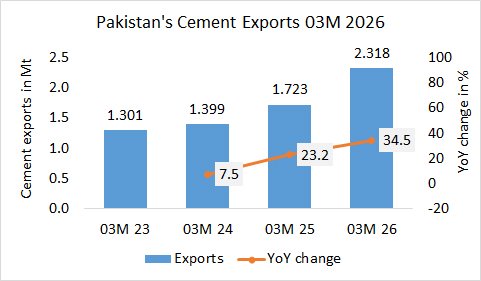 In the first 3 months in 2026, Pakistan’s cement exports increased by +34.5% to 2.318 Mt, after 1.723 Mt in the same period last year and 1.399 Mt in the year before.