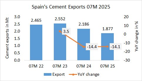 In the first 7 months in 2025, Spain’s cement exports decreased by -14.1% to 1.877 Mt, after 2.186 Mt in the same period last year and 2.552 Mt in the year before.