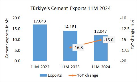 In the first 11 months in 2024, Türkiye’s cement exports declined by -15.0% to 12.047 Mt, after 14.181 Mt in the same period last year and 17.043 Mt in the year before.