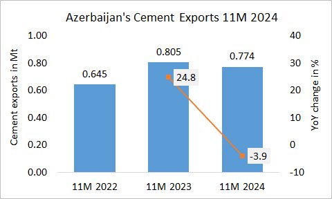 In the first 11 months in 2024, Azerbaijan’s cement exports declined by -3.9% to 0.774 Mt, after 0.805 Mt in the same period last year and 0.645 Mt in the year before.