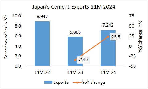 In the first 11 months in 2024, Japan’s cement exports increased by +23.5% to 7.242 Mt, after 5.866 Mt in the same period last year and 8.947 Mt in the year before.