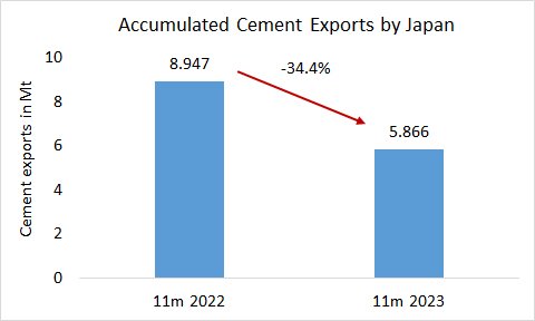 In Japan, the accumulated cement exports in the first 11 month 2023 declined by massive -34.4% to only 5.866 Mt Mt from 8.947 Mt in the same period last year. In November the exports only declined by -3.2% to 0.536…