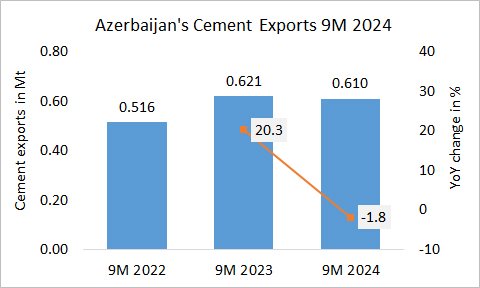 In the first 9 months in 2024, Azerbaijan’s cement exports declined by -1.8% to 0.610 Mt, after 0.621 Mt in the same period last year and 0.516 Mt in the year before.
