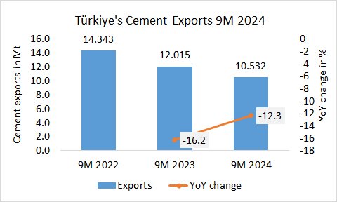 In the first 9 months of 2024, Türkiye’s cement exports declined by -16.5% to 10.029Mt, after 12.015 Mt in the same period last year and 14.343 Mt in the year before.