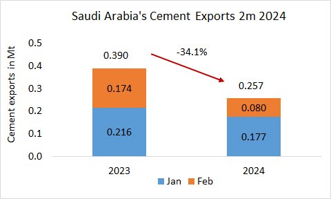 In the first 2 month of the year 2024, Saudi Arabia’s cement exports declined by -34.1% to 0.257 Mt, after 0.390 Mt in the same period in 2023. The exports declined by -18.1% YoY in January and and -54.0% YoY…
