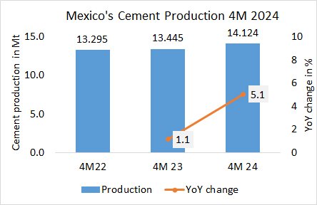 In the first 4 months of 2024, Mexico’s cement production (excl. grinding units) increased by +5.1% to 14.124 Mt, after 13.445 Mt same period last year and 13.295 Mt the year before.