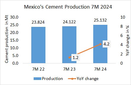 In the first 7 months of 2024, Mexico’s cement production (only integrated plants) increased by +4.2% to 25.132 Mt, after 24.122 Mt in the same period last year and 23.824 Mt in the year before.