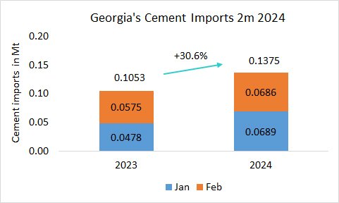 In the first 8 months of 2024, Georgia’s cement imports increased by +31.0% to 0.846 Mt, after 0.646 Mt in the same period last year and 0.534 Mt in the year before.