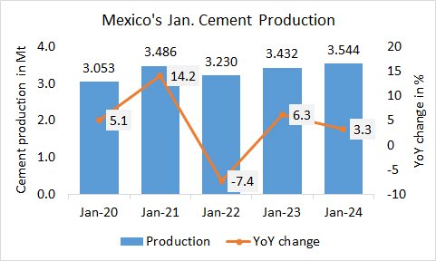 In Mexico the January 2024 grey cement production of the integrated cement plants increased by +3.3% to 3.544 Mt, after 3.432 Mt in Jan. last year and 3.230 Mt in Jan. 2022. This is the largest Jan. cement production within…