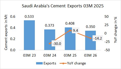 In the first 3 months in 2026, Saudi Arabia’s cement exports decreased by -14.2% to 0.350 Mt, after 0.408 Mt in the same period last year and 0.373 Mt in the year before.