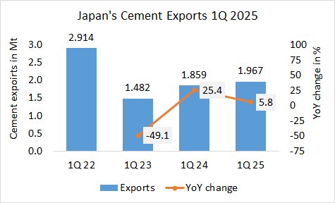 In the first quarter in 2025, Japan’s cement exports increased by +5.8% to 1.967 Mt, after 1.859 Mt in the same period last year and 1.482 Mt in the year before.