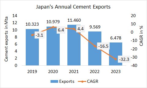 In Japan in the last two years, the cement exports nearly halved from 11.460 Mta 2021 to ‘only’ 6.478 Mta in 2023. Since 2021, in each year year there has been a 2-digit YoY decline, the massive minus of 32.3%…