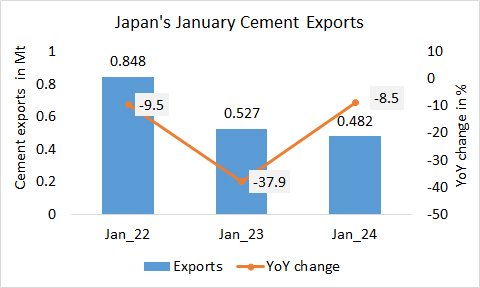 Japan’s cement exports further declined in January 2024 to only 0.482 Mt, after still 0.848 Mt in 2022. This is a decline by 43.2% in just 2 years.