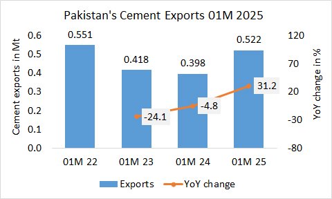 In January 2025, Pakistan’s cement exports increased by +31.2% to 0.522 Mt, after 0.398 Mt in the same period last year and 0.418 Mt in the year before.