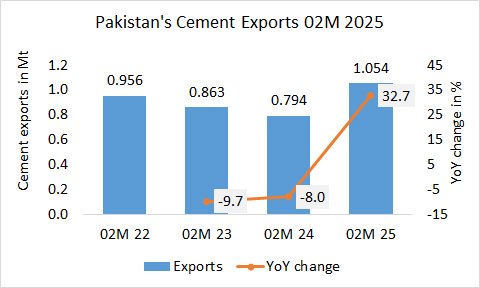In the first 2 months of 2025, Pakistan’s cement exports increased massively by +32.7% to 1.054 Mt, after 0.794 Mt same period last year and 0.863 Mt the year before