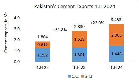 In the first half of calendar year 2024, Pakistan’s cement exports increased by +22.0% to 3.453 Mt, after 2.830 Mt same period last year and 1.864 Mt the year before.