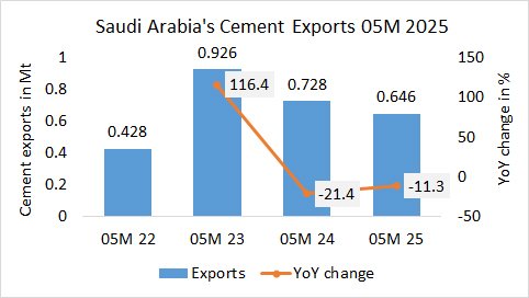 In the first 5 months in 2025, Saudi Arabia’s cement exports decreased by -11.3% to 0.646 Mt, after 0.728 Mt in the same period last year and 0.926 Mt in the year before.