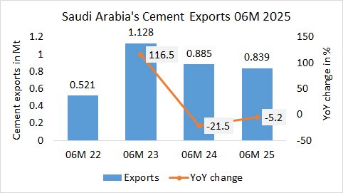 In the first half of 2025, Saudi Arabia’s cement exports decreased by -5.2% to 0.839 Mt, after 0.885 Mt in the same period last year and 1.128 Mt in the year before.