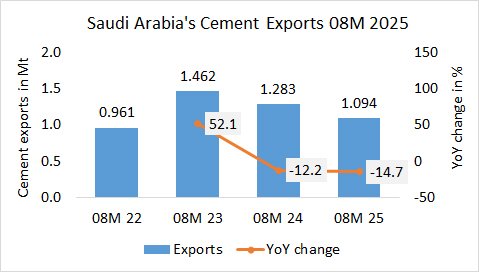 In the first 8 months in 2025, Saudi Arabia’s cement exports decreased by -14.7% to 1.094 Mt, after 1.283 Mt in the same period last year and 1.462 Mt in the year before.