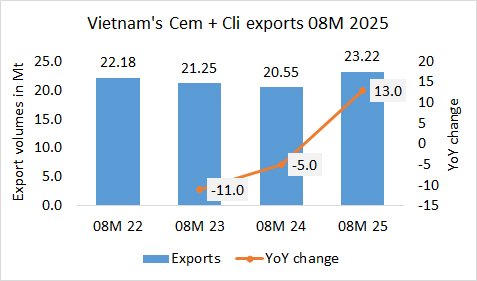 In the first 8 months in 2025, Vietnam’s cement and clinker exports increased by +13.0% to 23.22 Mt, after 20.55 Mt in the same period last year and 21.25 Mt in the year before.