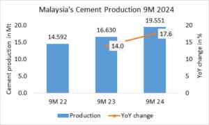 In the first 9 months in 2024, Thailand’s cement production declined by -4.5% to 26.159 Mt, after 27.379 Mt in the same period last year and 27.937 Mt in the year before.
