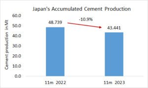 In Thailand, in the period from January to November 2023, the accumulated cement production declined by -1.9% to 32.825 Mt, after 33.468 Mt in the same period last year. In November the cement production declined by -3.2% YoY to 2.699 Mt.