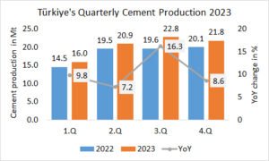 In Thailand, the cement production in 2023 declined in 3 of the 4 quarters, corresponding to an annual decline by -2.3% to 35.687 Mta, after 36.545 Mta in 2022. The largest declines were in the 2.Q and 3.Q, a small increase has been in the 3.Q.