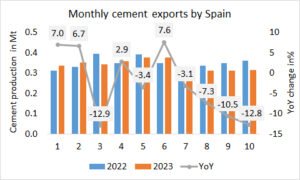 In Spain, from January to October 2023 the accumulated cement production declined by -2.3% to 15.236 Mt, from 15.593 Mt in the same period in 2022. However, the largest YoY decline has been in the least 3 month with -6.0%, -8.6% and -13.2%, respectively. In these last 3 month 4.182 Mt have been produced compared to 4.621 Mt in 2022, which results in a -9.5% YoY decline.