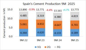 In the first 9 months in 2025, T+T’s (Trinidad + Tobago’s) cement production increased by +8.7% to 0.554 Mt, after 0.510 Mt in the same period last year and 0.536 Mt in the year before.