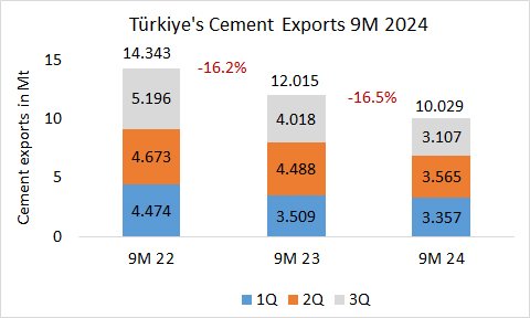 In the first 9 months in 2024, Türkiye’s cement exports declined by -16.5% to 10.029 Mt, after 12.015 Mt in the same period last year and 14.343 Mt in the year before.