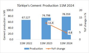 In the first 11 months in 2024, Türkiye’s cement exports declined by -15.0% to 12.047 Mt, after 14.181 Mt in the same period last year and 17.043 Mt in the year before.