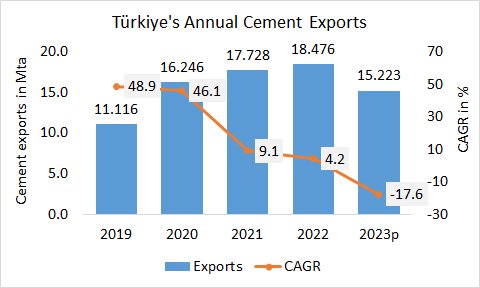 After several years of growth with up to 50% growth rates, in 2023 Türkiye’s cement exports declined by -17.6% to 15.223 Mta, after 18.476 Mta in 2023 and 17.728 Mta in 2022.