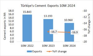 In the first 10 months in 2024, Türkiye’s cement production increased by +5.4% to 71.256 Mt, after 67.599 Mt in the same period last year and 60.606 Mt in the year before.