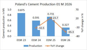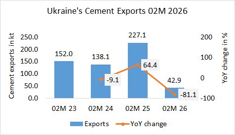 In the first 2 months in 2026, Ukraine’s cement exports decreased by -81.1% to 42.9 kt, after 227.1 kt in the same period last year and 138.1 kt the year before.