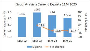 In the first 11 months in 2025, Ukraine’s cement exports increased by +24.0% to 2.090 Mt, after 1.686 Mt in the same period last year and 1.251 Mt in the year before.