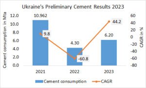In 2023, the cement production in the Ukraine increased by +38.2% to 7.45 Mta, after the huge decline by -51.0% to 5.39 Mta in the last year and 11.005 Mta in 2021.