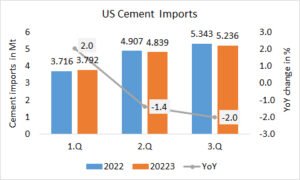 In the USA, in the first 3 quarters of 2023 in total 66.863 Mt of Portland and blended cements have been dispatched. This is a -2.9% YoY decline compared to 68.873 Mt in the same period last year. The largest YoY decline has been in the 1Q 2023 with -4.1%, while the lowest decline has been in the 2Q with -1.1%.