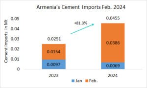 In Uzbekistan, In the first two months in 2024 the cement production by the large manufacturing plants increased by a massive +49.7% YoY to 1.353 Mt. The increase by +130% YoY in January declined to +14.9% in February.